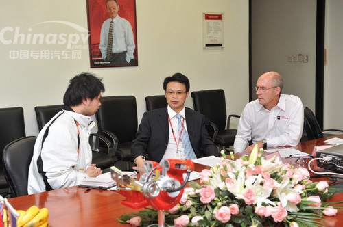 康明斯渦輪增壓技術亞洲業(yè)務總裁格林·普萊斯( 右一)和無錫康明斯渦輪增壓技術有限公司總經(jīng)理 陳華(中間)接受采訪