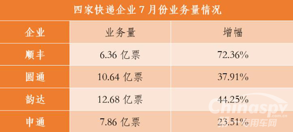 圓通速遞7月快遞產(chǎn)品收入22.98億元,同比增長6.06%;業(yè)務完成量10.64億票,同比增長37.91%;快遞產(chǎn)品單票收入2.16元,同比降23.10%。