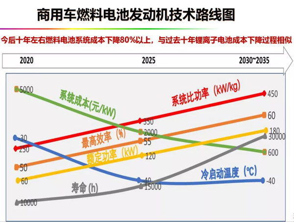 數(shù)據(jù)統(tǒng)計顯示現(xiàn)在的性能跟五年前相比,所有主要的性能指標都有大幅的提升,比如核心指標燃料電池壽命提升了300%。國產(chǎn)燃料電池零部件的產(chǎn)業(yè)鏈已經(jīng)建立,系統(tǒng)集成能力大幅增強,頭部企業(yè)正在形成,這就是目前的狀態(tài)。下一步的重點就是要使燃料電池系統(tǒng)成本十年內(nèi)下降80%以上。過去十年鋰離子電池就是這樣發(fā)展的,燃料電池滯后了十年。系統(tǒng)成本要從2020年的5000元/千瓦下降到2030年的600元/千瓦。
