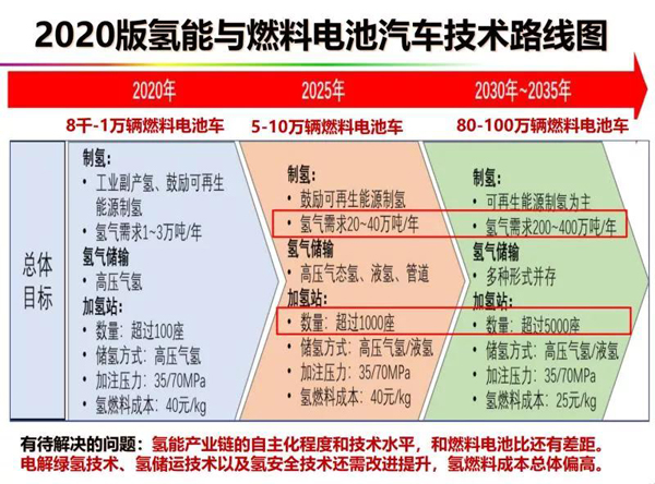 往前看氫能燃料電池的技術(shù)路線圖。2025年目標是推廣5-10萬氫燃料電池車;2030-2035年實現(xiàn)80-100萬輛應(yīng)用規(guī)模,這都是以商用車為主體。在這個情況下,氫需求量到2030年大概三百萬噸左右,這個可能比我們預(yù)期的低。這還是按商用車為主體預(yù)測的,如果主要是轎車,幾十萬噸就夠了。但加氫站的數(shù)量可能比我們想象的要多。因為加氫效率比加天然氣要低,氫是最輕的一種氣體,只是天然氣密度的1/8。當(dāng)前氫燃料電池汽車發(fā)展還面臨一些挑戰(zhàn),比如說氫燃料產(chǎn)業(yè)鏈自主化程度與技術(shù)水平和燃料電池還有差距,電解綠氫技術(shù)、氫儲運技術(shù)、氫安全技術(shù)還需要改進提升,氫燃料的成本總體偏高,這是今后5-10年必須努力解決的。