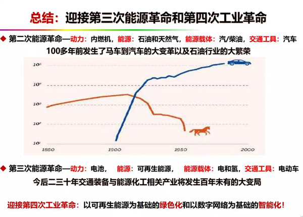 最后我做一個總結(jié)——迎接第三次能源革命和第四次工業(yè)革命。一百多年前的第二次能源革命引發(fā)了馬車到汽車的大轉(zhuǎn)型和石油行業(yè)的大繁榮。主要的轉(zhuǎn)型期從1900年開始,大概經(jīng)歷了25年左右?,F(xiàn)在第三次能源革命就在眼前。我估計與上次馬車到汽車的轉(zhuǎn)變類似,今后二三十年交通裝備與能源化工相關(guān)產(chǎn)業(yè)將發(fā)生百年未有之大變局。讓我們共同迎接第四次工業(yè)革命,也就是以可再生能源為基礎(chǔ)的綠色化和以數(shù)字網(wǎng)絡(luò)為基礎(chǔ)的智能化。