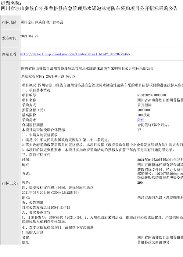 四川省涼山彝族自治州普格縣應(yīng)急管理局水罐泡沫消防車采購項目公開招標(biāo)采購公告