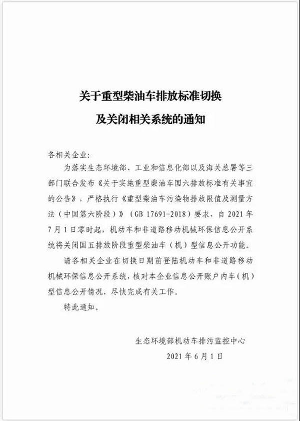 2021年6月1日,為落實生態(tài)環(huán)境部、工業(yè)和信息部以及海關總署等三部門聯合發(fā)《關于實施重型柴油車國六排放標準有關事宜的公告》,嚴格執(zhí)行《重型柴油車國六排放標準有關事宜的公告》,嚴格執(zhí)行《重型柴油車污染物排放限值及測量方法(中國第六階段)》(GB 17691-2018)要求,自2021年7月1日零時起,機動車和非道路移動機械環(huán)保信息公開系統(tǒng)將關閉國五排放階段重型柴油機車(機)型信息公開功能。