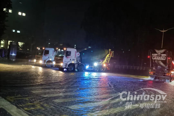 在緊要關(guān)頭,河南五建在前往一處賑災(zāi)地點時,更是派出了近20輛紅巖瑞江攪拌車。