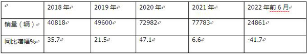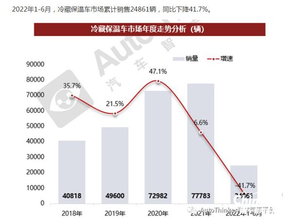 根據(jù)汽車智庫平臺數(shù)據(jù),2022年上半年冷藏車終端市場累計銷售24861輛,同比下滑41.7%(見截圖1),降幅居近年最大。