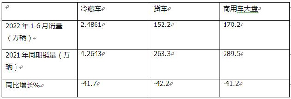 表1,2022年1-6月冷藏車銷量、同比增速與商用車各細分市場及大盤比較(數(shù)據(jù)來源:汽車智庫平臺及中汽協(xié))