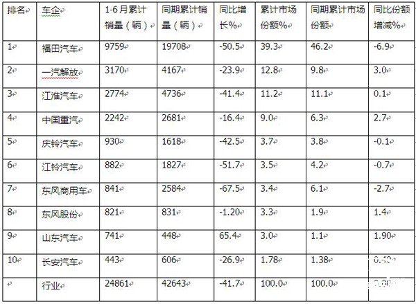 總體看,今年上半年福田汽車獨大霸榜,一汽解放和江淮汽車分別居第二、第三;TOP10同比1增9減,山東汽車是唯一同比正增長的車企;市場份額同比6增4減,一汽解放份額增加最多,表現(xiàn)搶眼。