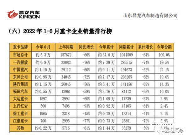 6月份過后,2022年上半年的重卡市場累計(jì)銷售37.9萬輛,比上年同期的104.5萬輛下降64%,減少了66.6萬輛。整個二季度,重卡市場累計(jì)銷售14.71萬輛,同比下降71%,凈減少36.6萬輛。