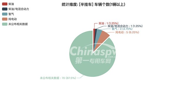 在本次公告的80款半掛車中,東風(fēng)特汽(十堰)客車有限公司(1輛,占比1.25%)、中國(guó)第一汽車集團(tuán)有限公司;中國(guó)第一汽車集團(tuán)有限公司(1輛,占比1.25%)、凱博易控車輛科技(蘇州)股份有限公司(1輛,占比1.25%)、廈門金龍聯(lián)合汽車工業(yè)有限公司(1輛,占比1.25%)、山東眾聯(lián)能創(chuàng)動(dòng)力科技有限公司(2輛,占比2.5%)、湖南道依茨動(dòng)力有限公司(1輛,占比1.25%)、特百佳動(dòng)力科技有限公司(1輛,占比1.25%)、蘇州眾聯(lián)能創(chuàng)新能源科技有限公司(1輛,占比1.25%)、蘇州綠控傳動(dòng)科技股份有限公司(1輛,占比1.25%)、未公布相關(guān)數(shù)據(jù)(70輛,占比87.5%)。