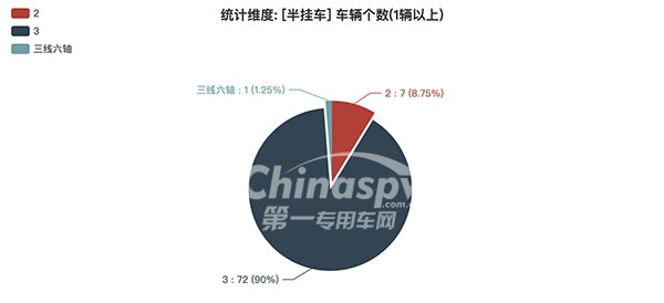 本次公告中的80款半掛車中,2軸(7輛,占比8.75%)、3軸(72輛,占比90%)、三線六軸(1輛,占比1.25%)。