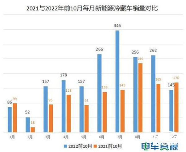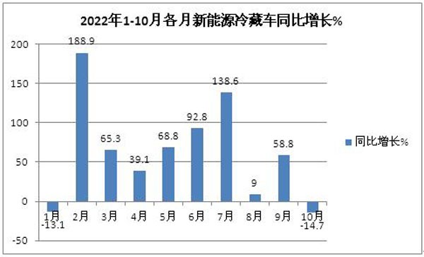上圖表可見,2022年1-10月各月新能源冷藏車同比8增2降,其中7月銷量最高,同比2月增幅最大。在今年1-10月中,只有1月和10月銷量同比是下降的,其余各月都是增長的。今年1月銷量同比下降主要是受到季節(jié)性影響,而今年10月銷量同比下降可能是受到近期疫情影響所致。