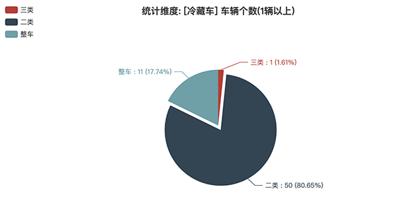 本次公告中的62輛冷藏車中,三類(1輛,占比1.61%)、二類(50輛,占比80.65%)、整車(11輛,占比17.74%)。