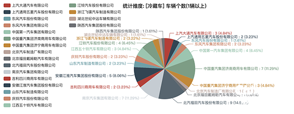 本次公告中的62輛冷藏車生產(chǎn)企業(yè)情況如下,上汽大通汽車有限公司(3輛,占比4.84%)、上汽通用五菱汽車股份有限公司(2輛,占比3.23%)、東風(fēng)汽車股份有限公司(1輛,占比1.61%)、東風(fēng)汽車集團(tuán)有限公司(2輛,占比3.23%)、中國第一汽車集團(tuán)有限公司(4輛,占比6.45%)、中國重汽集團(tuán)濟(jì)南商用車有限公司(7輛,占比11.29%)、中國重汽集團(tuán)濟(jì)寧商用車有限公司(3輛,占比4.84%)、北京汽車制造廠有限公司(1輛,占比1.61%)、北京福田戴姆勒汽車有限公司(1輛,占比1.61%)、北汽福田汽車股份有限公司(9輛,占比14.52%)、南京汽車集團(tuán)有限公司(7輛,占比11.29%)、吉利四川商用車有限公司(2輛,占比3.23%)、安徽江淮汽車集團(tuán)股份有限公司(5輛,占比8.06%)、山東汽車制造有限公司(2輛,占比3.23%)、慶鈴汽車股份有限公司(2輛,占比3.23%)、江西五十鈴汽車有限公司(3輛,占比4.84%)、江鈴汽車股份有限公司(4輛,占比6.45%)、浙江飛碟汽車制造有限公司(2輛,占比3.23%)、湖北世紀(jì)中遠(yuǎn)車輛有限公司(1輛,占比1.61%)、陜西汽車集團(tuán)股份有限公司(1輛,占比1.61%)。