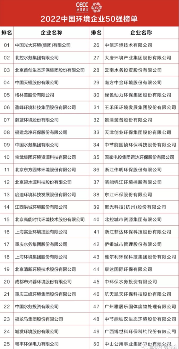 據(jù)了解,2022中國環(huán)境企業(yè)50強榜單以企業(yè)申報為基礎(chǔ),以公正公開為原則,以真實數(shù)據(jù)為依據(jù),結(jié)合上規(guī)模環(huán)境企業(yè)調(diào)研,按照2021年度營業(yè)收入總額降序排列產(chǎn)生。