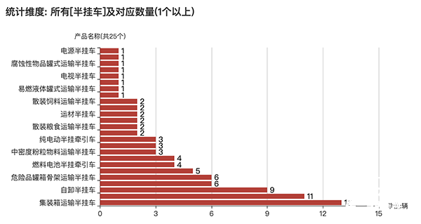 本次公告中的87款半掛車共包含25種車型,集裝箱運(yùn)輸半掛車(13輛)、倉柵式運(yùn)輸半掛車(11輛)、自卸半掛車(9輛)、平板運(yùn)輸半掛車(6輛)、危險(xiǎn)品罐箱骨架運(yùn)輸半掛車(6輛)、廂式運(yùn)輸半掛車(5輛)、燃料電池半掛牽引車(4輛)、普通液體運(yùn)輸半掛車(4輛)、中密度粉粒物料運(yùn)輸半掛車(3輛)、低平板半掛車(3輛)、純電動(dòng)半掛牽引車(3輛)、鋁合金集裝箱運(yùn)輸半掛車(2輛)、散裝糧食運(yùn)輸半掛車(2輛)、翼開啟廂式半掛車(2輛)、運(yùn)材半掛車(2輛)、換電式純電動(dòng)半掛牽引車(2輛)、散裝飼料運(yùn)輸半掛車(2輛)、空載集裝箱運(yùn)輸半掛車(1輛)、易燃液體罐式運(yùn)輸半掛車(1輛)、危險(xiǎn)品半掛牽引車(1輛)、電視半掛車(1輛)、半掛牽引車(1輛)、腐蝕性物品罐式運(yùn)輸半掛車(1輛)、計(jì)量檢衡半掛車(1輛)、電源半掛車(1輛)。