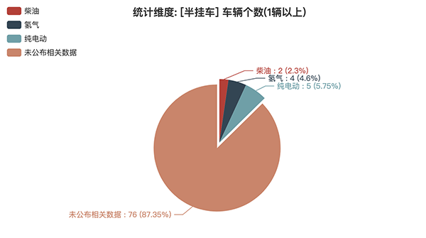 本次公告中的87款半掛車中,柴油(2輛,占比2.3%)、氫氣(4輛,占比4.6%)、純電動(dòng)(5輛,占比5.75%)、未公布相關(guān)數(shù)據(jù)(76輛,占比87.36%)。