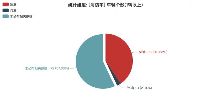 本次公告中的128款消防車中,柴油(52輛,占比40.62%)、汽油(3輛,占比2.34%)、未公布相關數(shù)據(jù)(73輛,占比57.03%)。