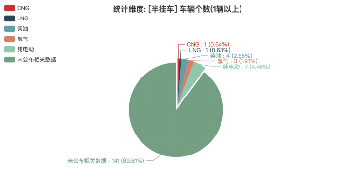 本次公告中的157款半掛車中,CNG(1輛,占比0.64%)、LNG(1輛,占比0.64%)、柴油(4輛,占比2.55%)、氫氣(3輛,占比1.91%)、純電動(dòng)(7輛,占比4.46%)、未公布相關(guān)數(shù)據(jù)(141輛,占比89.81%)。