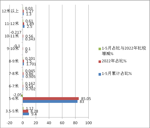 上圖表顯示,在今1-5月按長度段劃分,各個長度段救護(hù)車銷量占比呈現(xiàn)以下特點: