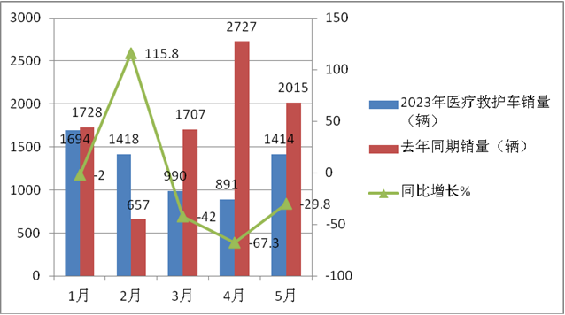 2023年1-5月各月醫(yī)療救護(hù)車銷量及同比(數(shù)據(jù)來源:終端上牌信息)
