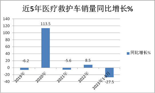 上圖表顯示,2023年1-5月醫(yī)療救護(hù)車?yán)塾嬐认陆?7.5%,其同比降幅是近5年最大的。也就是說,今年1-5月醫(yī)療救護(hù)車銷量同比增幅創(chuàng)近年新低,這是今年前5月醫(yī)療救護(hù)車市場一個明顯的特點。據(jù)分析主要原因有: