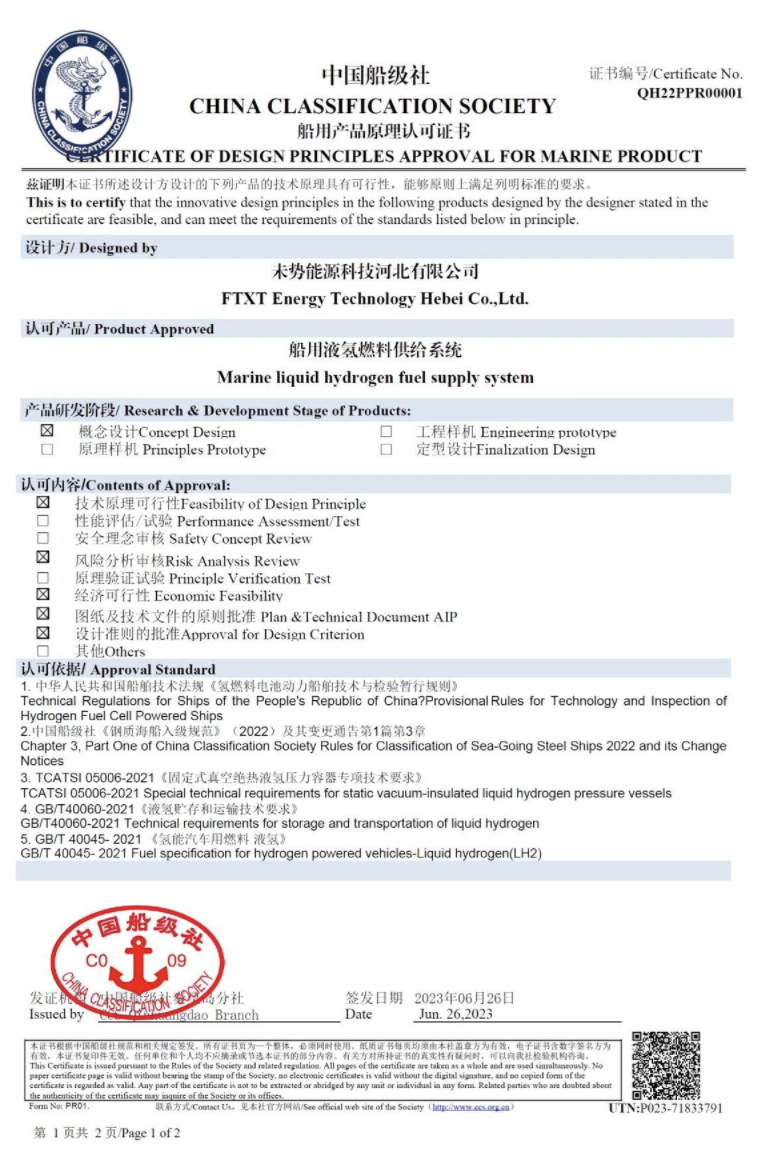 國(guó)內(nèi)首張!未勢(shì)能源船用液氫供給系統(tǒng)獲得中國(guó)船級(jí)社CCS認(rèn)證