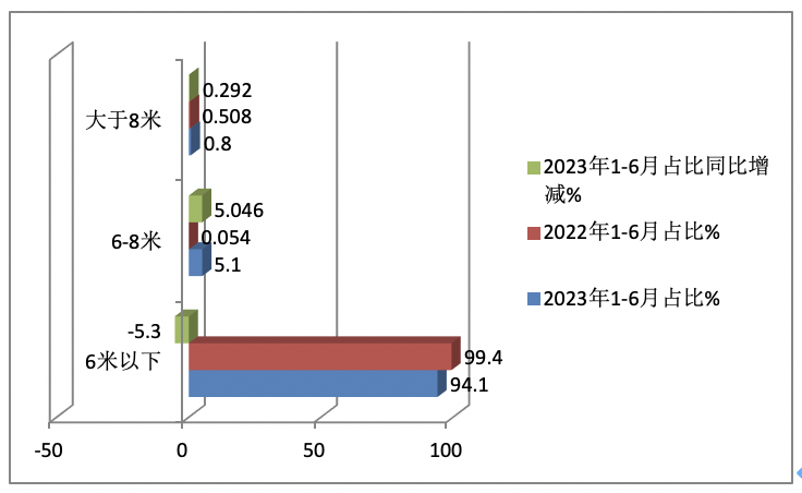 ----2023年1-6月8米段以上房車?yán)塾嬩N售62輛,市場占比為0.8%,居最小,占比同比增加0.292個百分點,是占比同比增加第二多的細(xì)分車型。