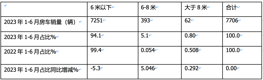 表4,按車型長度段劃分,2023年1-6月與2022年同期房車市場銷量及占比同比增減統(tǒng)計(數(shù)據(jù)來源:終端上牌信息)
