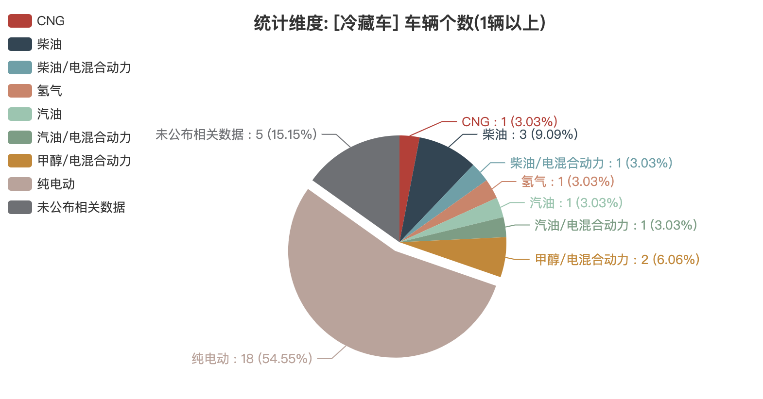本次公告中的33款冷藏車中,CNG(1輛,占比3.03%)、柴油(3輛,占比9.09%)、柴油/電混合動(dòng)力(1輛,占比3.03%)、氫氣(1輛,占比3.03%)、汽油(1輛,占比3.03%)、汽油/電混合動(dòng)力(1輛,占比3.03%)、甲醇/電混合動(dòng)力(2輛,占比6.06%)、純電動(dòng)(18輛,占比54.55%)、未公布相關(guān)數(shù)據(jù)(5輛,占比15.15%)。