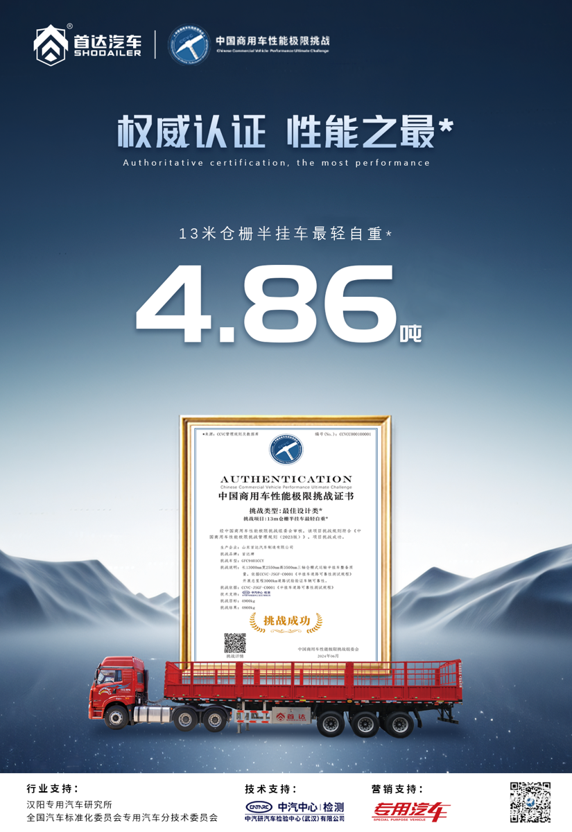 在參與中國商用車性能極限挑戰(zhàn)中的“13米倉柵半掛車自重極限挑戰(zhàn)”項目后,首達汽車的“超輕拉煤王”不僅以卓越的成績通過了極限挑戰(zhàn),更以其創(chuàng)新的技術和出色的性能,為半掛車行業(yè)樹立了新的標桿。
