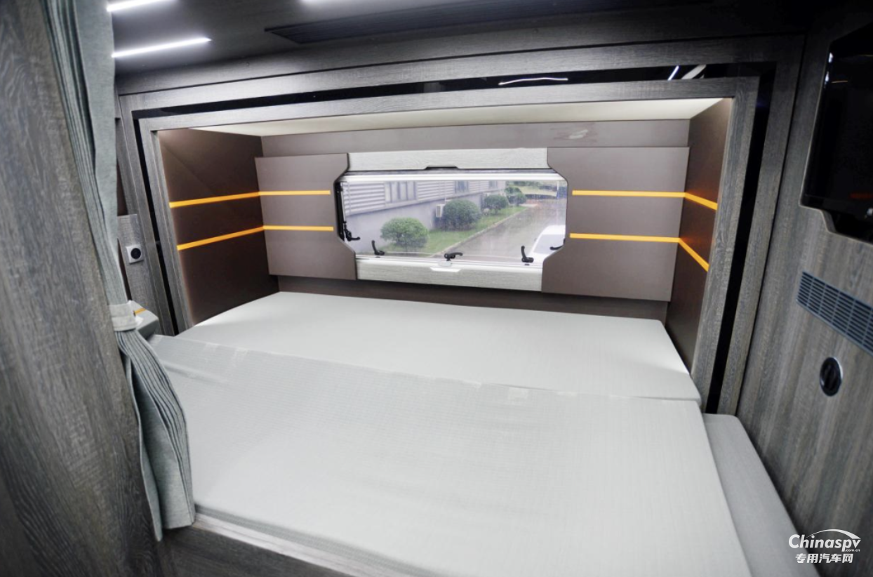 車(chē)尾為固定橫床布局,拓展展開(kāi)后整個(gè)區(qū)域可以供兩人睡臥使用,床鋪標(biāo)配有慢回彈海綿床墊,保障了用戶(hù)睡臥的舒適。床鋪前方配有一臺(tái)電視機(jī),內(nèi)側(cè)設(shè)計(jì)有電源接口、閱讀燈、置物格等設(shè)施,豐富的便利性設(shè)施帶來(lái)更優(yōu)的旅居體驗(yàn)。