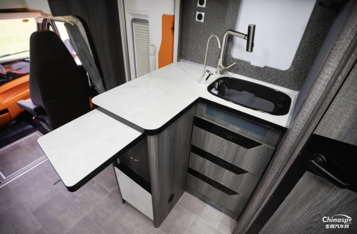 廚房區(qū)為L(zhǎng)型布局,側(cè)面設(shè)計(jì)有拓展板可臨時(shí)增加操作臺(tái)面積,此處為用戶(hù)配備了直飲水系統(tǒng)、多功能洗菜盆、電磁爐、微波爐等生活設(shè)施,會(huì)客區(qū)后方配置了一臺(tái)224L冰箱,擁有冷凍冷藏功能,用戶(hù)可以在旅居時(shí)攜帶新鮮食物。
