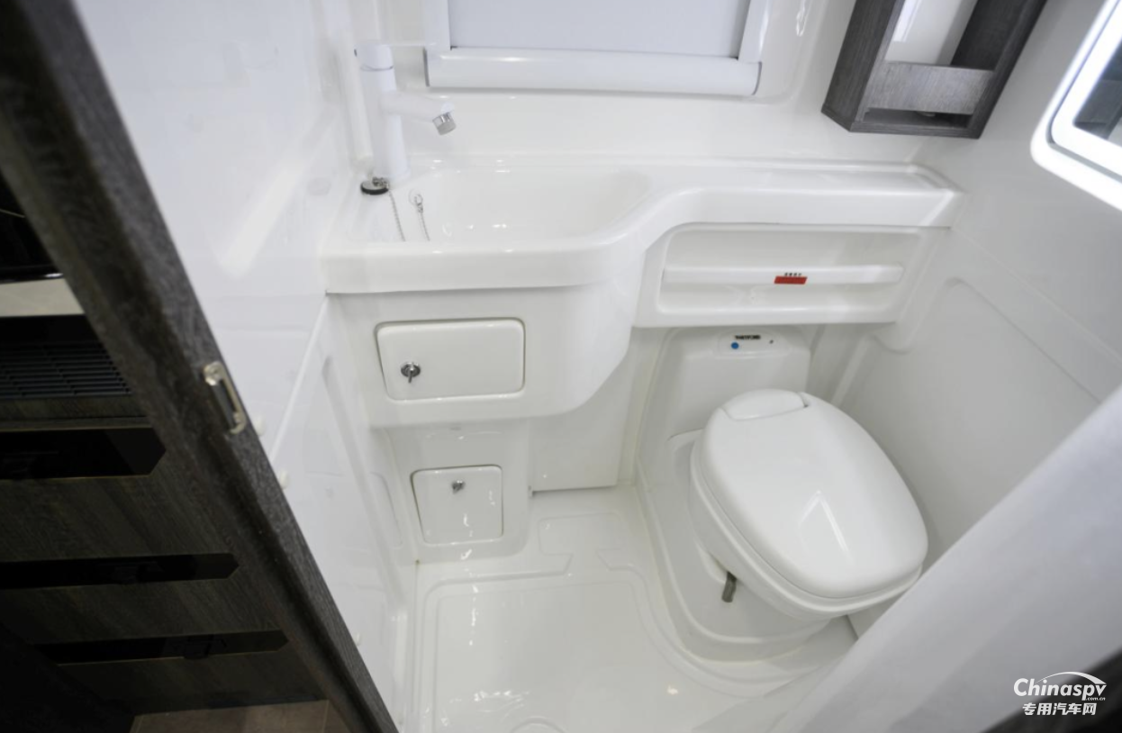 衛(wèi)浴間為吸塑一體式設(shè)計(jì),內(nèi)部配備有除霧鏡、賽特福德坐便器、換氣扇等,衛(wèi)浴設(shè)施齊全,保障了用戶(hù)旅居淋浴洗漱等需求??紤]到旅居時(shí)衣物清潔問(wèn)題,賽德在車(chē)廂內(nèi)部為用戶(hù)配備了一臺(tái)大宇3kg洗烘一體機(jī),清洗衣物更加方便。