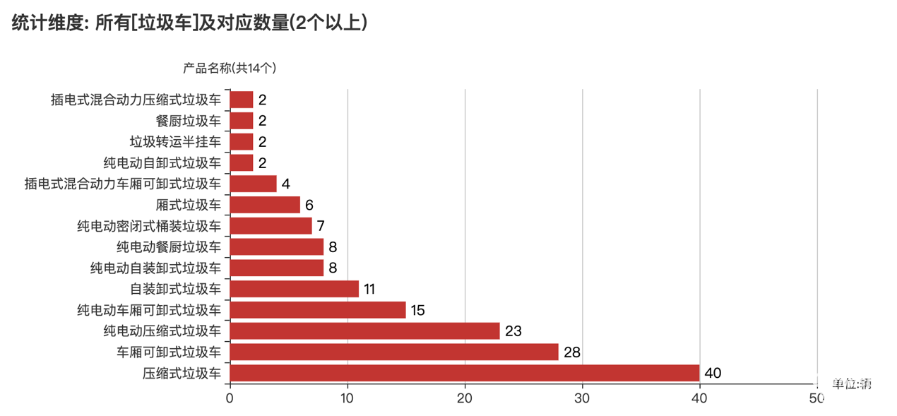 本次公告中的165款垃圾車的車型共有21種,壓縮式垃圾車(40輛)、車廂可卸式垃圾車(28輛)、純電動(dòng)壓縮式垃圾車(23輛)、純電動(dòng)車廂可卸式垃圾車(15輛)、自裝卸式垃圾車(11輛)、純電動(dòng)自裝卸式垃圾車(8輛)、純電動(dòng)餐廚垃圾車(8輛)、純電動(dòng)密閉式桶裝垃圾車(7輛)、廂式垃圾車(6輛)、插電式混合動(dòng)力車廂可卸式垃圾車(4輛)、餐廚垃圾車(2輛)、純電動(dòng)自卸式垃圾車(2輛)、插電式混合動(dòng)力壓縮式垃圾車(2輛)、垃圾轉(zhuǎn)運(yùn)半掛車(2輛)、換電式純電動(dòng)車廂可卸式垃圾車(1輛)、自卸式垃圾車(1輛)、純電動(dòng)垃圾轉(zhuǎn)運(yùn)車(1輛)、換電式純電動(dòng)自卸式垃圾車(1輛)、純電動(dòng)桶裝垃圾運(yùn)輸車(1輛)、純電動(dòng)分撿垃圾運(yùn)輸車(1輛)、純電動(dòng)廂式垃圾車(1輛)。