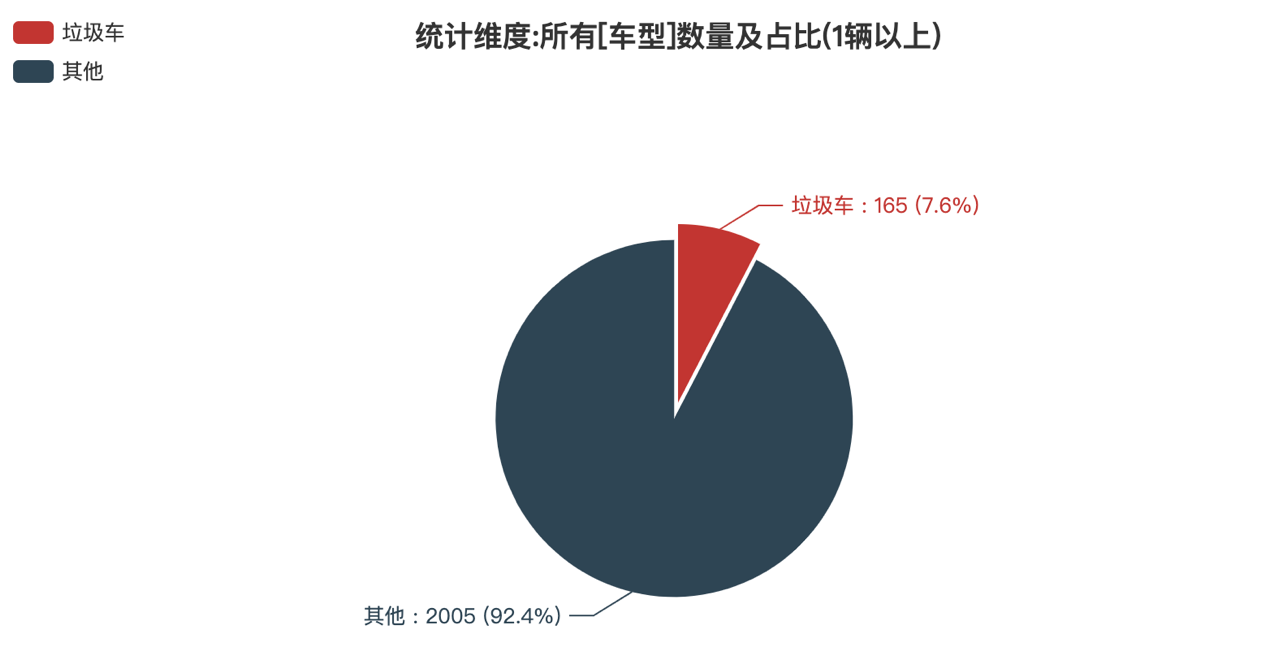 第385批新車產(chǎn)品公示中的2170輛產(chǎn)品中,垃圾車(165輛,占比7.6%)。