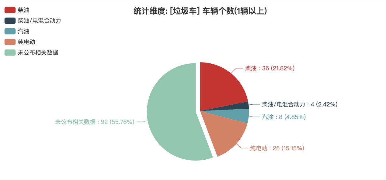 本次公告中的165款垃圾車中,燃油種類情況如下:柴油(36輛,占比21.82%)、柴油/電混合動(dòng)力(4輛,占比2.42%)、汽油(8輛,占比4.85%)、純電動(dòng)(25輛,占比15.15%)、未公布相關(guān)數(shù)據(jù)(92輛,占比55.76%)。
