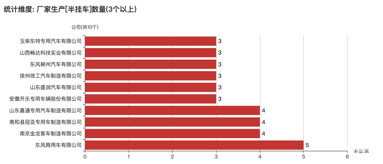 本次公告中的113款半掛車(chē)的生產(chǎn)企業(yè)共有73家,東風(fēng)商用車(chē)有限公司(5輛)、山東嘉通專(zhuān)用汽車(chē)制造有限公司(4輛)、南京金龍客車(chē)制造有限公司(4輛)、南和縣冠亞專(zhuān)用車(chē)制造有限公司(4輛)、山西暢達(dá)科技實(shí)業(yè)有限公司(3輛)、山東盛潤(rùn)汽車(chē)有限公司(3輛)、安徽開(kāi)樂(lè)專(zhuān)用車(chē)輛股份有限公司(3輛)、東風(fēng)柳州汽車(chē)有限公司(3輛)、徐州徐工汽車(chē)制造有限公司(3輛)、玉柴東特專(zhuān)用汽車(chē)有限公司(3輛)、中國(guó)第一汽車(chē)集團(tuán)有限公司(2輛)、成安縣森陽(yáng)交通設(shè)備制造有限公司(2輛)、鄭州宇通集團(tuán)有限公司(2輛)、河北匯達(dá)能源有限公司(2輛)、蚌埠樂(lè)虎汽車(chē)零部件有限公司(2輛)、駐馬店中集華駿車(chē)輛有限公司(2輛)、河南亞特車(chē)輛有限公司(2輛)、湖北力威汽車(chē)有限公司(2輛)、中石油江漢機(jī)械研究所有限公司(2輛)、河北昌驊專(zhuān)用汽車(chē)有限公司(2輛)、中集車(chē)輛(集團(tuán))股份有限公司(2輛)、青縣金銳專(zhuān)用汽車(chē)制造有限公司(2輛)、山東駿華車(chē)輛有限公司(2輛)、湖北世紀(jì)中遠(yuǎn)車(chē)輛有限公司(2輛)、通亞汽車(chē)制造有限公司(2輛)等。