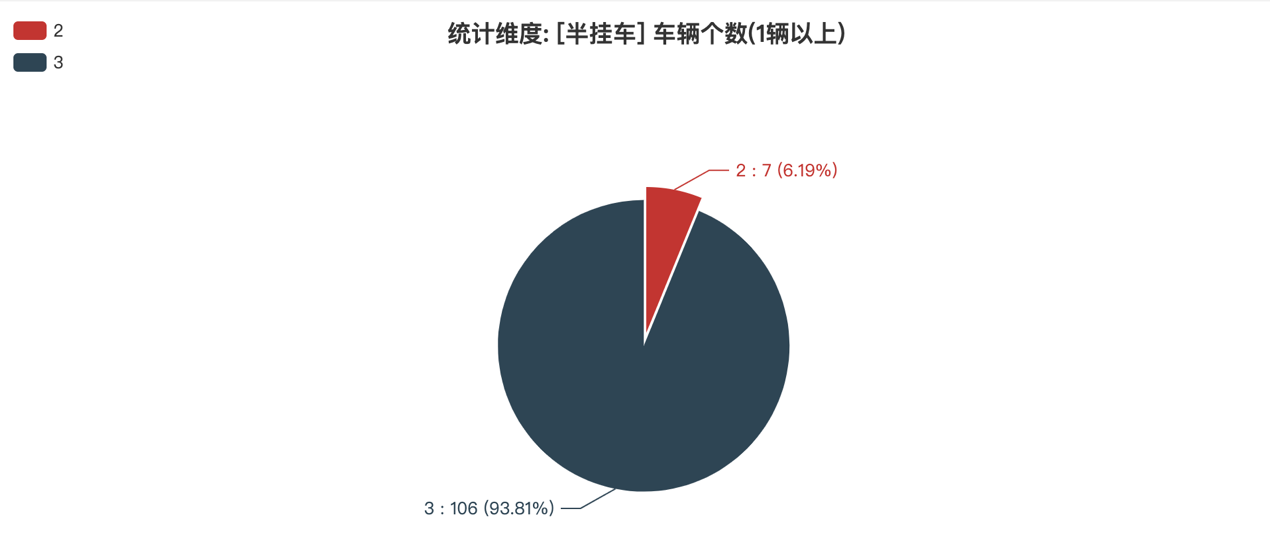 本次公告中的113款半掛車(chē)中,車(chē)型軸數(shù)情況如下:2(7輛,占比6.19%)、3(106輛,占比93.81%)。