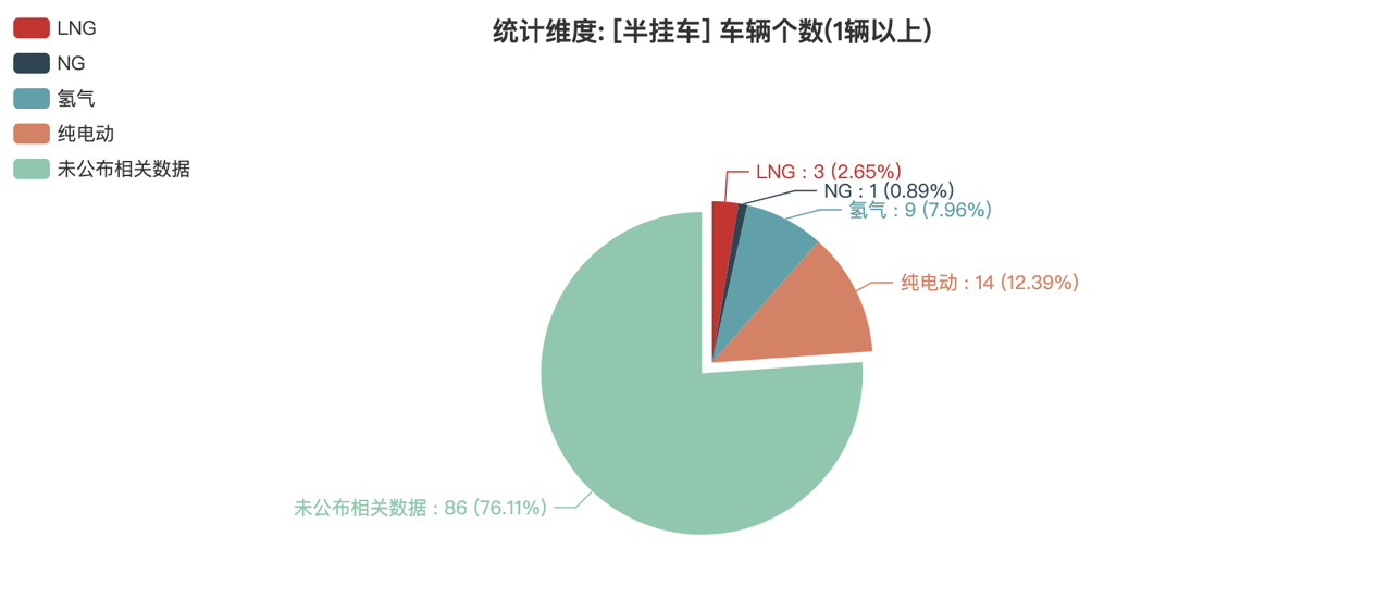 本次公告中的113款半掛車(chē)中,LNG(3輛,占比2.65%)、NG(1輛,占比0.88%)、氫氣(9輛,占比7.96%)、純電動(dòng)(14輛,占比12.39%)、未公布相關(guān)數(shù)據(jù)(86輛,占比76.11%)。