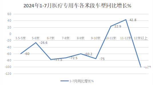 上圖表顯示,在今年1-7月按長度段劃分,各個長度段救護車銷量及同比呈現(xiàn)以下特點: