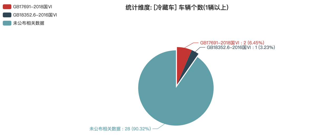 本次公告中的31款冷藏車中,排放標準情況如下:GB17691-2018國Ⅵ(2輛,占比6.45%)、GB18352.6-2016國Ⅵ(1輛,占比3.23%)、未公布相關(guān)數(shù)據(jù)(28輛,占比90.32%)。