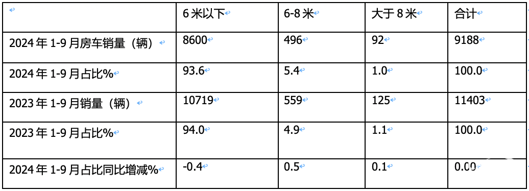 表3,按車型長(zhǎng)度段劃分,2024年1-9月與2023年同期房車市場(chǎng)銷量及占比同比增減統(tǒng)計(jì)(數(shù)據(jù)來源:終端上牌信息)