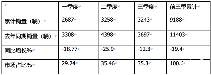 ---今年三季度房車?yán)塾?jì)銷售3243輛,同比下降12.3%,是降幅最小的季節(jié),市場(chǎng)占比35.3%,居第二