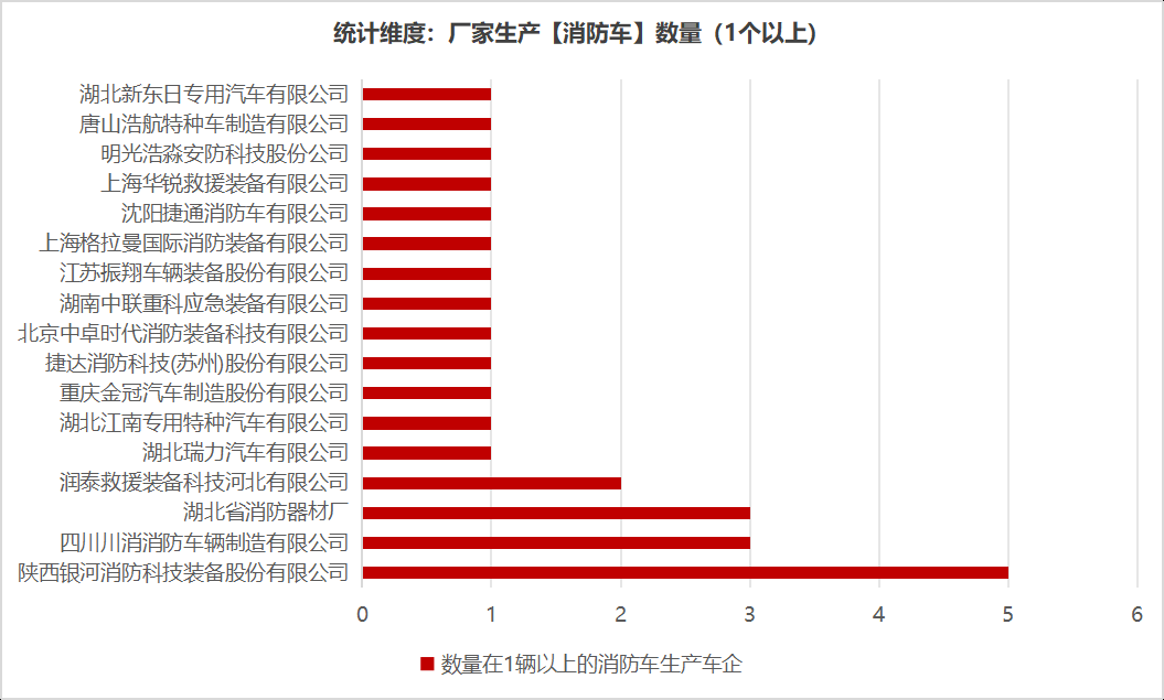 本次公告中的26款消防車的生產(chǎn)企業(yè)共有17家,陜西銀河消防科技裝備股份有限公司(5輛)、四川川消消防車輛制造有限公司(3輛)、湖北省消防器材廠(3輛)、潤泰救援裝備科技河北有限公司(2輛)、湖北瑞力汽車有限公司(1輛)、湖北江南專用特種汽車有限公司(1輛)、重慶金冠汽車制造股份有限公司(1輛)、捷達(dá)消防科技(蘇州)股份有限公司(1輛)、北京中卓時(shí)代消防裝備科技有限公司(1輛)、湖南中聯(lián)重科應(yīng)急裝備有限公司(1輛)、江蘇振翔車輛裝備股份有限公司(1輛)、上海格拉曼國際消防裝備有限公司(1輛)、上海格拉曼國際消防裝備有限公司(1輛)、上海華銳救援裝備有限公司(1輛)、明光浩淼安防科技股份公司(1輛)、唐山浩航特種車制造有限公司(1輛)、湖北新東日專用汽車有限公司(1輛)。