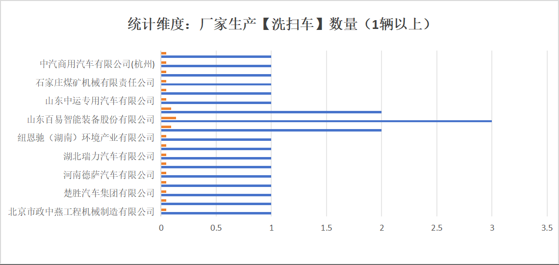 本次公告中的22款洗掃車的生產(chǎn)企業(yè)共有18家,北京市政中燕工程機械制造有限公司(1輛)、程力專用汽車股份有限公司(1輛)、楚勝汽車集團有限公司(1輛)、河北萬利特種車輛制造有限公司(1輛)、河南德薩汽車有限公司(1輛)、河南億翔專用汽車有限公司(1輛)、湖北瑞力汽車有限公司(1輛)、湖北馨雅通達(dá)汽車科技有限公司(1輛)、紐恩馳(湖南)環(huán)境產(chǎn)業(yè)有限公司(1輛)、三一環(huán)境產(chǎn)業(yè)有限公司(2輛)、山東百易智能裝備股份有限公司(3輛)、山東祥農(nóng)專用車輛有限公司(2輛)、山東中運專用汽車有限公司(1輛)、陜汽大同專用汽車有限公司(1輛)、石家莊煤礦機械有限責(zé)任公司(1輛)、長沙中聯(lián)重科環(huán)境產(chǎn)業(yè)有限公司(1輛)、中汽商用汽車有限公司(杭州)(1輛)、中植一客成都汽車有限公司(1輛)。