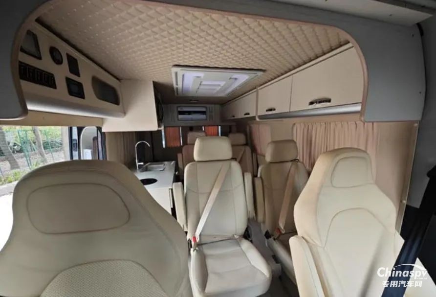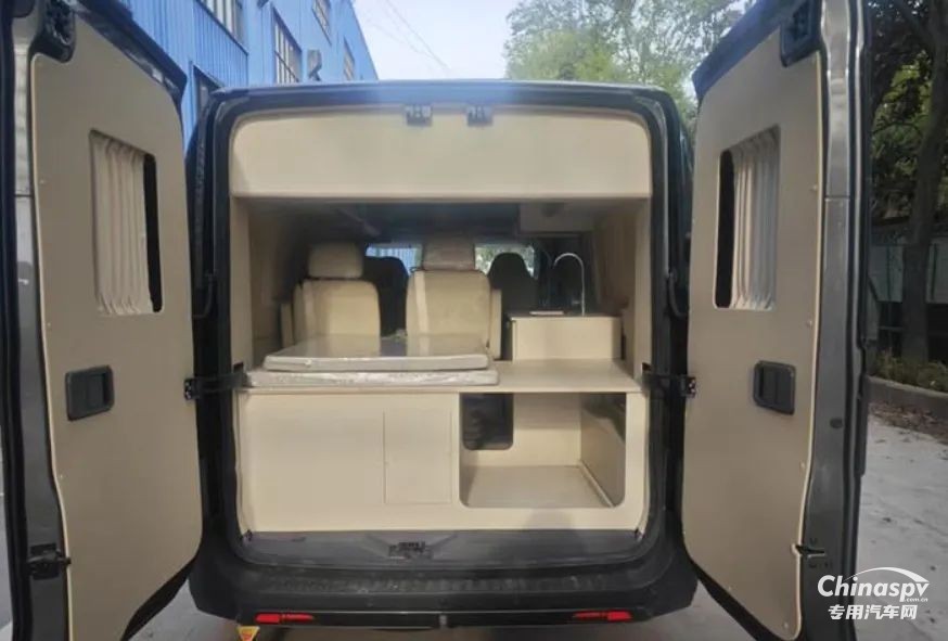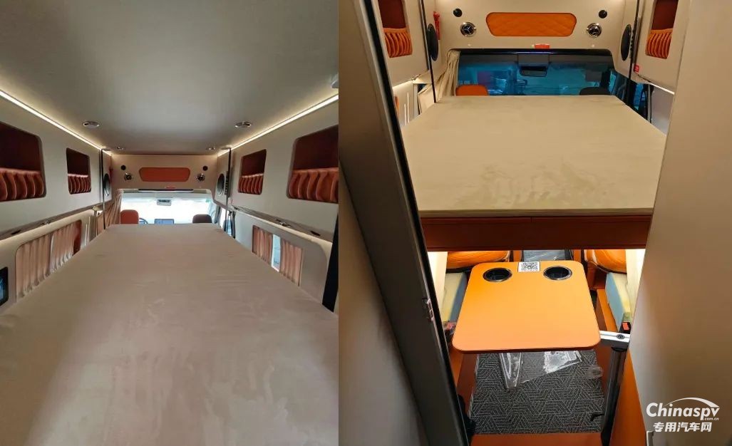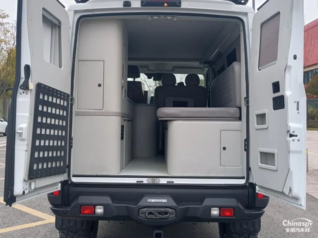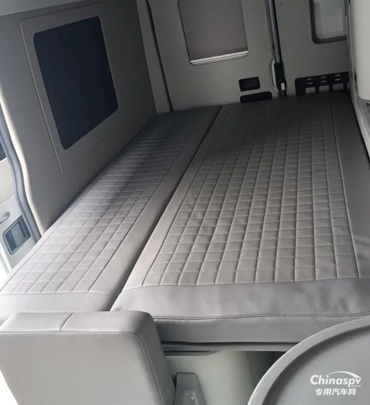 尾部則采用的是一張橫置床鋪,下方預(yù)留有儲物空間,個(gè)人猜測床板掀起后下方空間還可以作為簡單淋浴使用,除此以外也可以看到車內(nèi)加裝了吊柜、空調(diào)、內(nèi)飾軟包等設(shè)施。