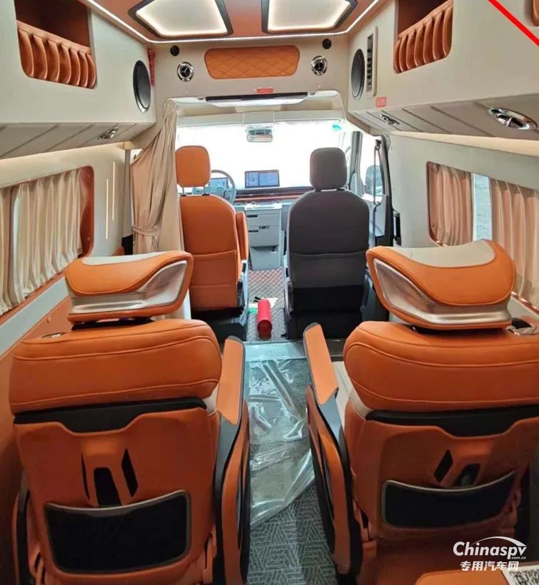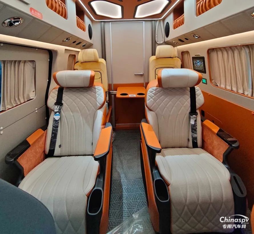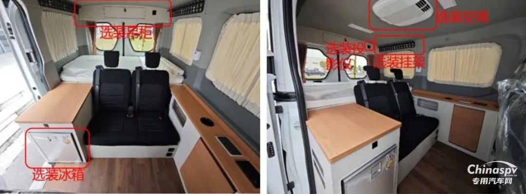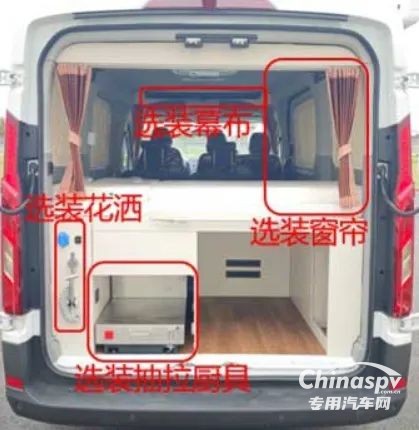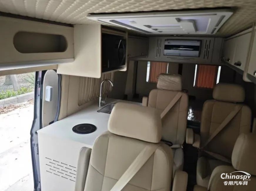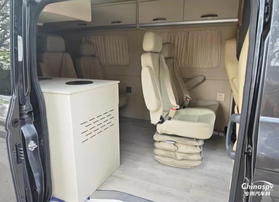 尾部則采用的是一張橫置床鋪,下方預(yù)留有儲物空間,個(gè)人猜測床板掀起后下方空間還可以作為簡單淋浴使用,除此以外也可以看到車內(nèi)加裝了吊柜、空調(diào)、內(nèi)飾軟包等設(shè)施。