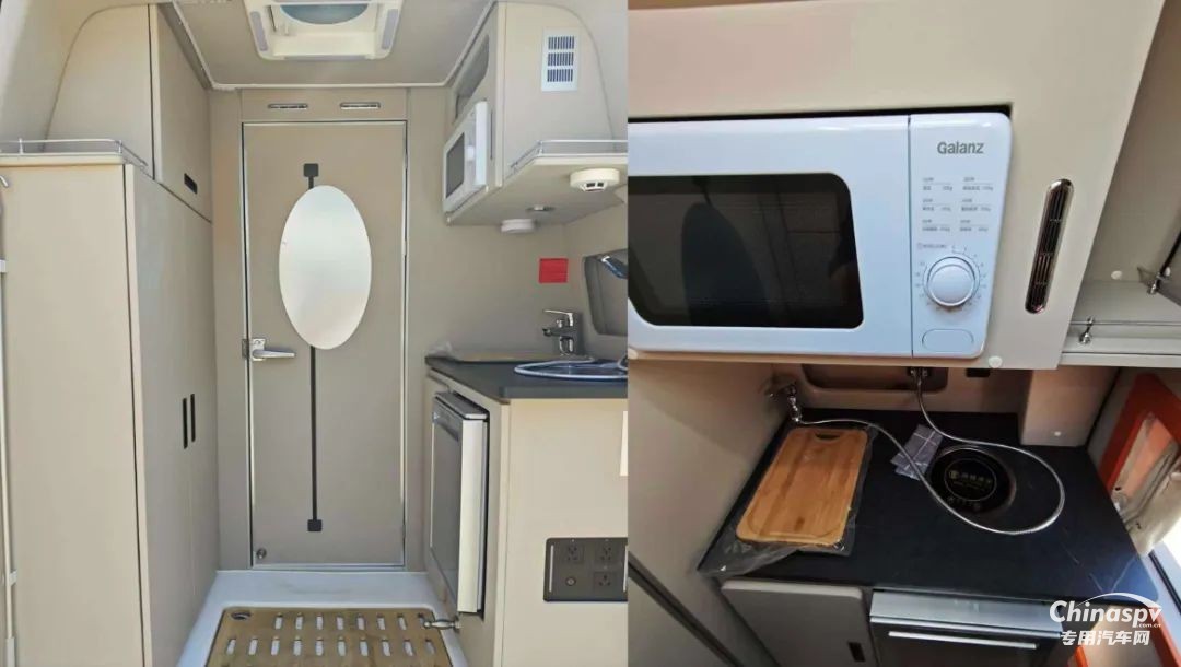 車尾部則是廚房以及儲物的區(qū)域,通過封閉門可以打造成前后兩個(gè)獨(dú)立空間,另外也可以看到后方空間地板上預(yù)留有排水口,也就意味著簡單沖洗也沒問題。