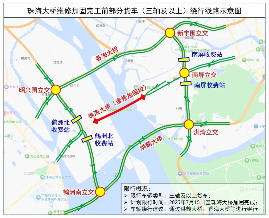 一、2025年7月15日起,全天限制三軸及以上貨車通行珠海大橋。限行結(jié)束時(shí)間結(jié)合珠海大橋維修加固工程進(jìn)度另行發(fā)布。