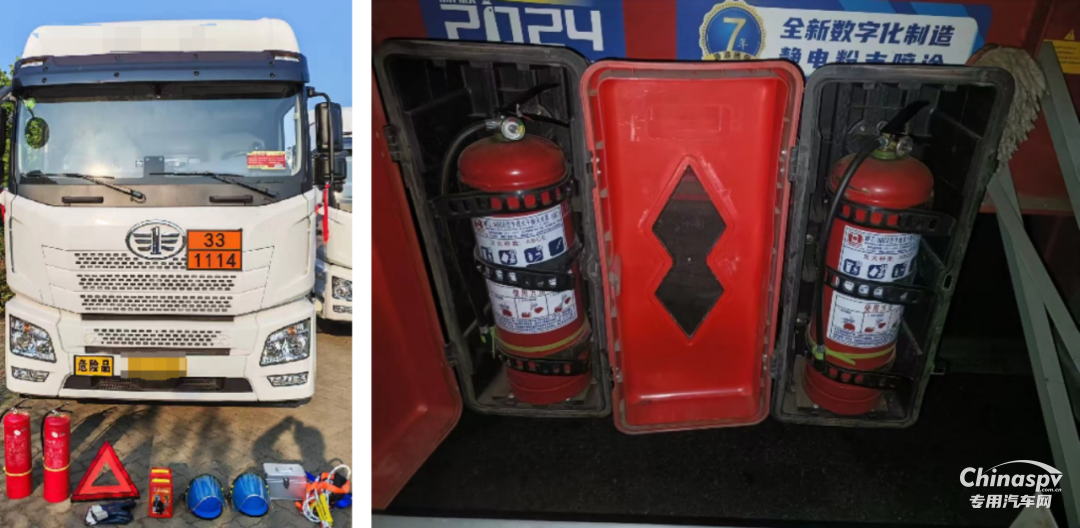 (1)車輛須配備2個(gè)4KG以上干粉滅火器, 駕駛室內(nèi)應(yīng)配備1個(gè)不小于1KG的滅火器,且完好有效,便于取用。